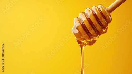 Honey cascading from a wooden dipper against a vibrant yellow backdrop A delightful bee product for your creative projects with ample space for text