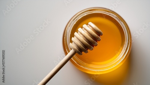 honey dipper resting beside a glass jar of golden honey captured from a top down perspective in bright natural light