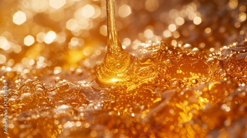 Honey dripping from a wooden honey dipper on honeycombs, on a golden bokeh background
