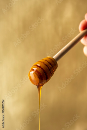 Honey dripping from honey dipper on yellow background.