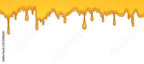 Honey drops on white background. Template, layout ad mock up. Place for text and presentations. Delicious honey flowing from edge, cafe, shop and bakery menu. Cartoon flat vector illustration