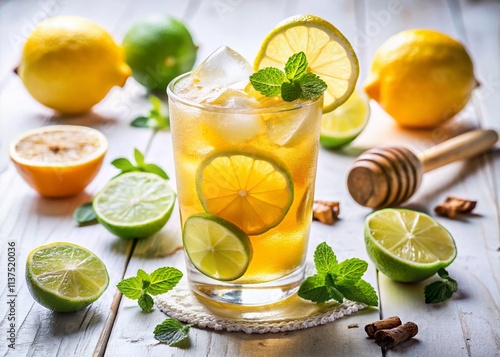 Honey Lemon Iced Soda Lime Drink Photography - Refreshing Summer Beverage Image