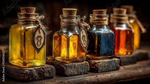 Honey Variety with Flavors, Glass Bottles, and Rustic.