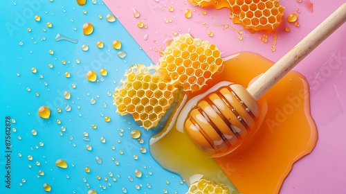 Honey with wooden honey dipper and honeycombs isolated on colorful background