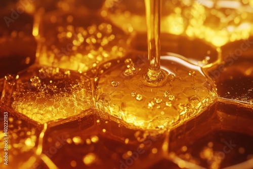 Honeycomb macro dripping golden honey hexagonal wax cells