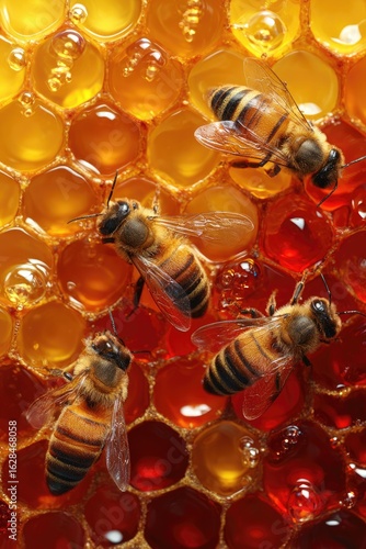 Honeycomb with busy bees. Close-up view of honeycombs in varying shades of amber and red, filled with honey. Three bees are visible, perched and moving on the honey-filled cells