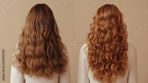 Honey-treated curly hair, before-and-after images highlighting enhanced curl structure and natural shine, Realistic 3D Render, Neutral Background