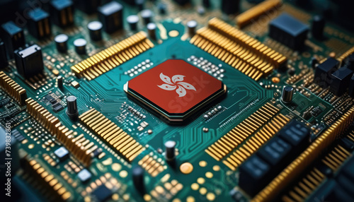 Hong kong flag on a processor, CPU or microchip on a motherboard. Concept for the battle of global microchips production.