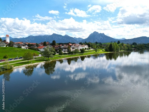 Hopfensee lake and town Hopenfen Swabia Bavaria Germany drone aerial view