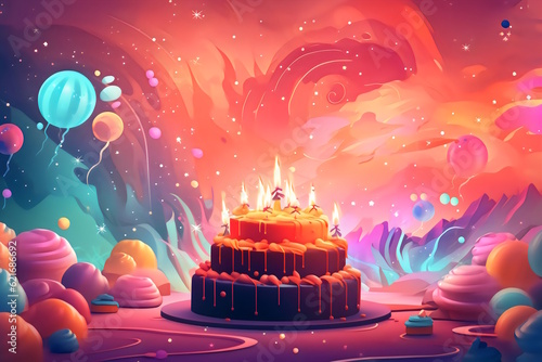 Horizontal Background with Colorful Cake and Festive Candles, Creating a Vibrant Atmosphere for a Children's Celebration. Generative AI