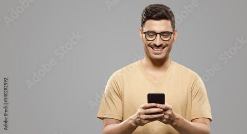 Horizontal banner of handsome smiling man with smartphone, smiling at screen, isolated on gray