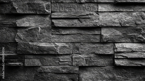 Horizontal black and grey stone brick wall with a textured surface. This stone brick wall provides ample space for creative photo compositions and designs.