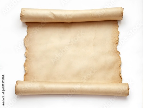 Horizontal parchment scroll with frayed edges, beige tone, and visible texture. Both ends are rolled inward, set against a plain white background.