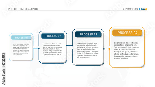 Horizontal timeline or flowchart with four square elements and space for data. Concept of 4 successive steps of company process.