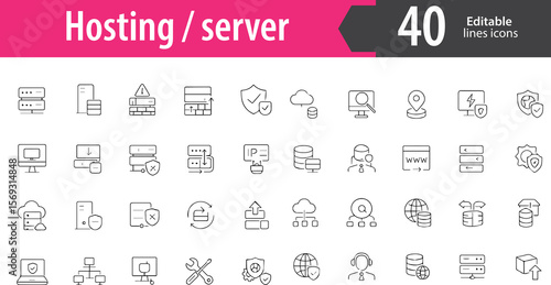 Hosting and Server Line Icons, Data Center, Cloud Server, Rack, Upload, Network Storage, Editable Formats: AI, EPS, PNG, JPG, Ideal for Both Digital and Print Use