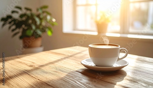 hot cappuccino in a white ceramic cup on a rustic wooden table, minimalist background, natural lighting from side window