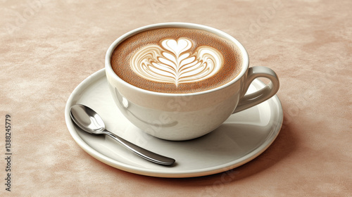 Hot cappuccino placed on a table in a warm-toned coffee shop background