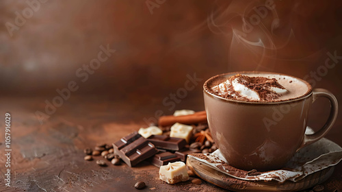 Hot chocolate in a brown cup on a brown background. The cup is surrounded by chocolate bars, cocoa beans, and cinnamon sticks.