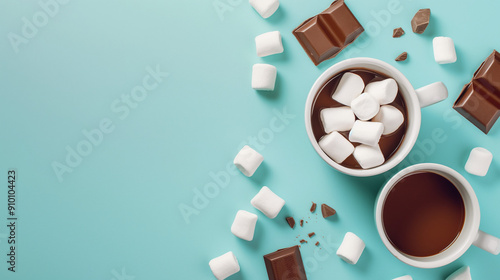Hot cocoa with marshmallows in white mugs and chunks of chocolate on a cyan background, cozy winter drink concept