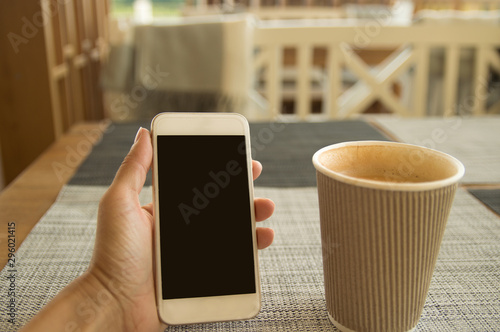 Hot coffee in a paper cup is on the table in the cafeteria. A man holds a phone in his hand.