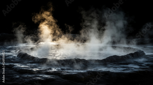 Hot spring surrounded by steam rising into dark background showcases natural relaxation and tranquility