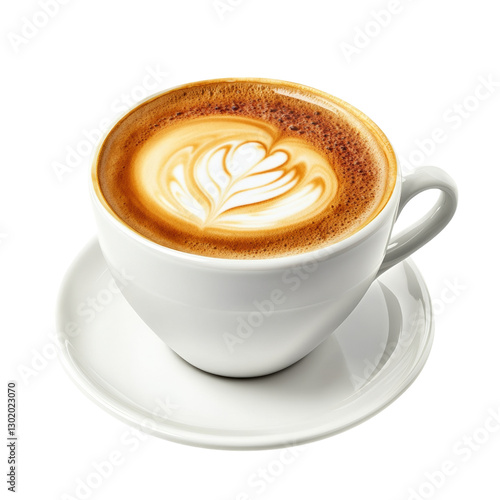 Hot steaming cup of coffee on a wooden table surrounded by coffee beans and a cozy atmosphere for relaxation isolated on transparent background..