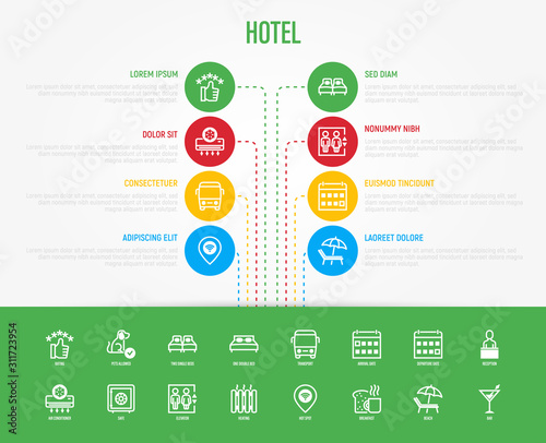 Hotel infographics template with copy space and thin line icons: rating, pet allowed, single bed, double bed, elevator, arrival date, departure date, heating, breakfast, bar. Vector illustration.