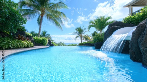 Hotel Resort Pool Pool with water slide, palm trees, lush landscaping, family friendly resort, fun in the sun