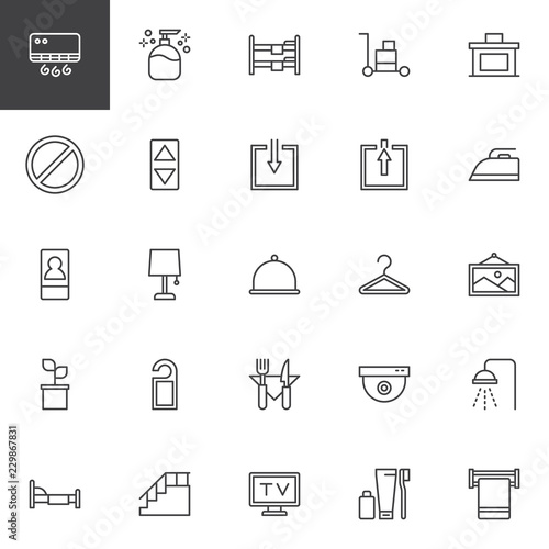 Hotel service outline icons set. linear style symbols collection, line signs pack. vector graphics. Set includes icons as Air conditioner, Liquid soap, Bunk bed, Not disturb hanger, Single bed, Bell