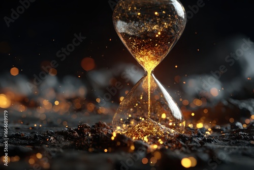 Hourglass with golden glitter flowing against a dark, bokeh-filled background. Use for time-related concepts, deadlines, scarcity, or preciousness of time.