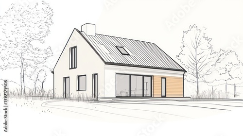 House architectural sketch, modern home design, countryside setting, illustration for building plans