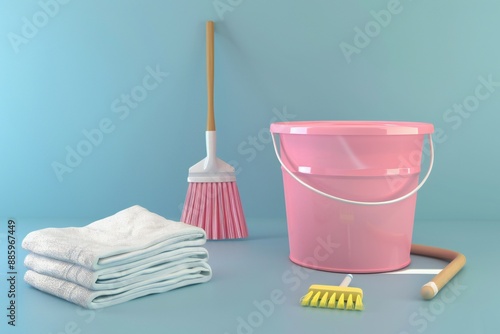 House cleaning equipment: buckets, rags, mop in 3D style , generated by ai