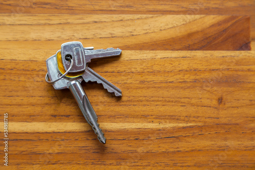 House door key on top of a wooden table. copy space. space for text. Key concept. Home concept.