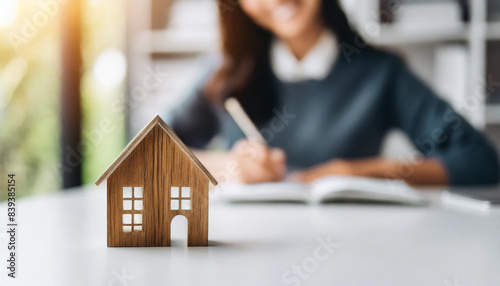 house figure sits on a white table with a blurred woman in the background, symbolizing real estate, home buying, and the housing market in a modern and sleek visual style