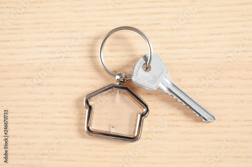 House key with trinket on wooden background, top view