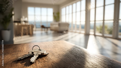 House keys on a polished wooden table in a sunlit modern home isolated on a transparent background