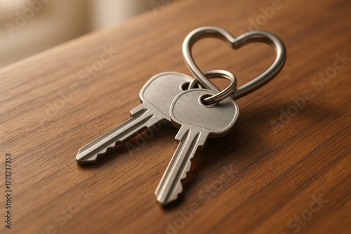House keys with heart keychain on wooden surface symbolizing love trust and the emotional value of home ownership real estate security and family dreams