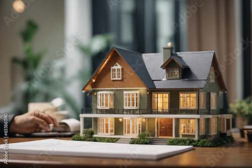 House model and contract, agent and customers discussing buying renting house, get insurance or loan real estate or property on background. Concept of mortgage. Generative AI
