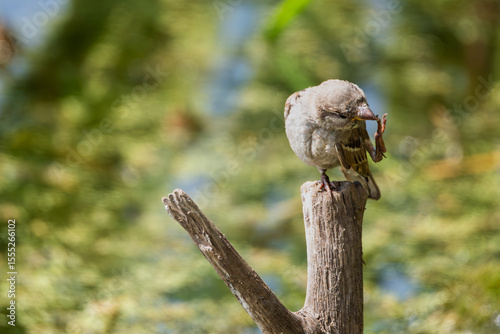 House sparrow (Passer domesticus) rubbing its foot on its beak in a grooming gesture.