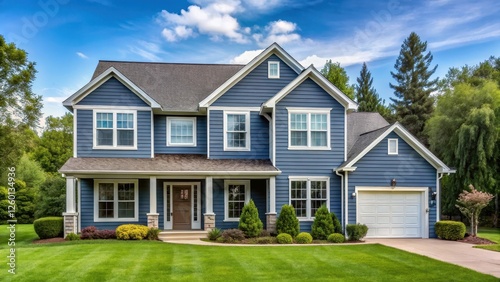 House with two story blue gray exterior walls made of wood and vinyl siding standing alone on a green lawn with trees nearby, suburban home, blue house