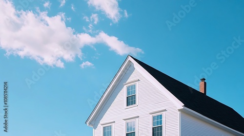 House with white siding and black roof against a beautiful blue sky, Real estate Marketing Concept