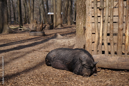 Household Pig Enjoys Relaxing In Dirt. Large Black Pig Resting In Sand. Domestic Pig.