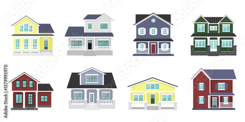 Houses with porch vector set. Collection of two-storey house with porch for rent, for sale in flat style. Vector illustration