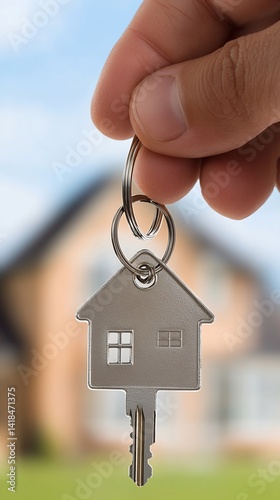 House-Shaped Key Held by Hand with Blurred House Background