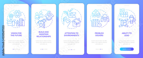 Housing developer characteristics blue gradient onboarding mobile app screen. Walkthrough 5 steps graphic instructions with linear concepts. UI, UX, GUI template. Myriad Pro-Bold, Regular fonts used