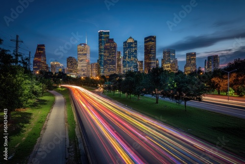 Houston Skyline Twilight: Cityscape at Dusk with Light Trails