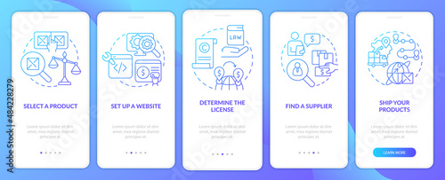How to start export business blue gradient onboarding mobile app screen. Walkthrough 5 steps graphic instructions pages with linear concepts. UI, UX, GUI template. Myriad Pro-Bold, Regular fonts used