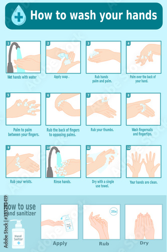 How to wash your hands properly step by step and how to use hand sanitizer. Personal hygiene infographic. Prevention virus and bacteria. Illustration vector. Avoid infection procedure.
