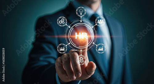 HR Management Technology: Businessman Taps Virtual Interface for Human Resources, Talent Acquisition, and Employee Growth Solutions. Modern HR Tech.