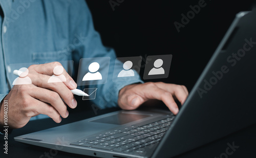 HR manager use laptop with HR Human Resources management concept. icons for recruitment process to work efficiently and achieve sustainable business success. team building.
